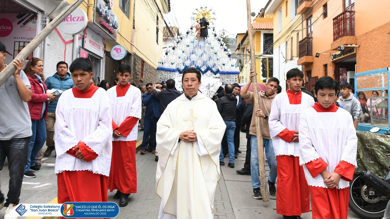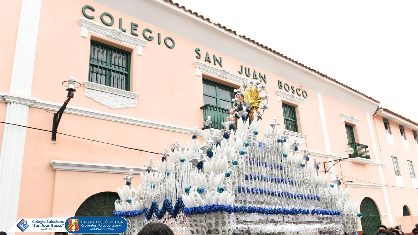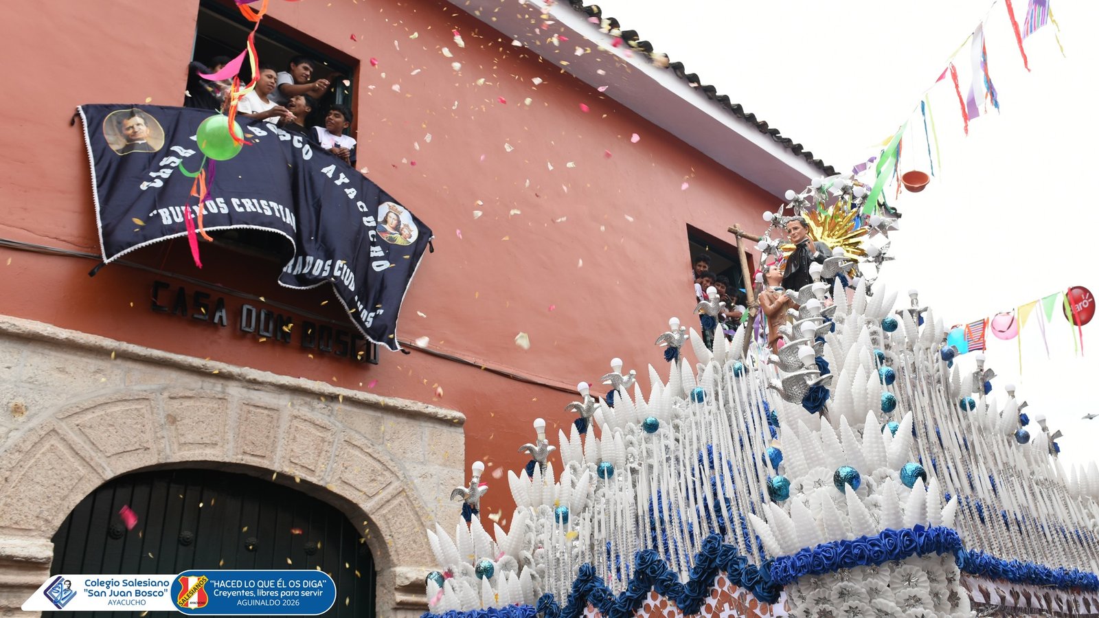 La celebraci贸n continu贸 el s谩bado 31 de enero con una conmovedora procesi贸n por las calles de la ciudad de Huamanga, aut茅ntica manifestaci贸n de fe y gratitud. La comunidad acompa帽贸 con devoci贸n a Don Bosco, renovando el compromiso de vivir sus ense帽anzas en la vida cotidiana. Al culminar la procesi贸n, se celebr贸 la Eucarist铆a de Fiesta, momento central de acci贸n de gracias, en el que se realiz贸 la entrega de cargos a las promociones correspondientes.