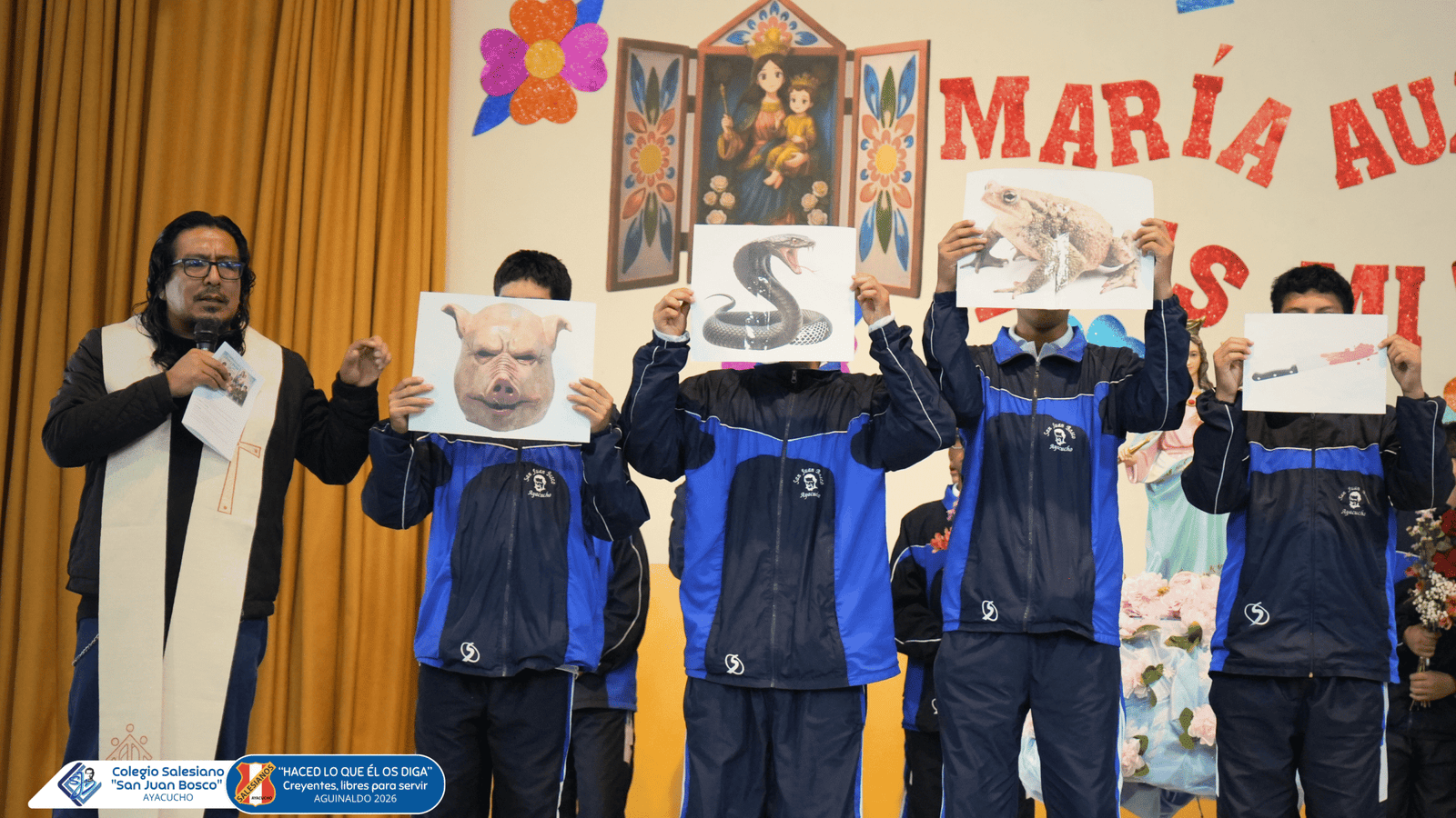 Durante el momento de oración salesiana, se compartió el mensaje inspirado en un sueño de San Juan Bosco, el cual invitó a reflexionar sobre la autenticidad del corazón de los jóvenes. A través de esta enseñanza, se recordó que no basta cumplir por obligación, sino que es necesario ofrecer a Dios y a la Virgen una vida sincera, expresada en el esfuerzo diario, el estudio, la obediencia y la amistad verdadera.